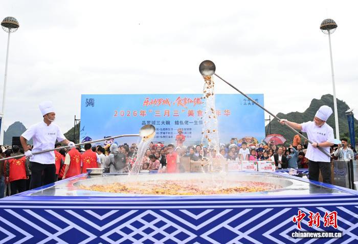 图为正在广西罗乡仫佬族自制县成龙湖广场,厨师正在巨型锅边翻勺仫佬摄生汤。受删师 摄