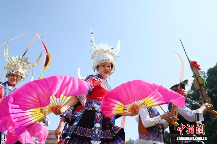 图为正在广西罗乡仫佬族自制县小少安镇木栾农庄,公众正在跳芦笙舞。受删师 摄