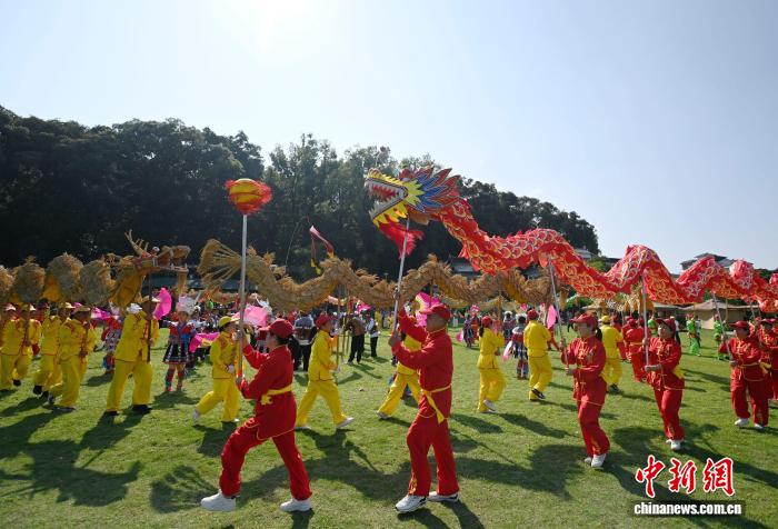 图为正在广西罗乡仫佬族自制县小少安镇木栾农庄,公众正在停止舞龙上演。受删师 摄